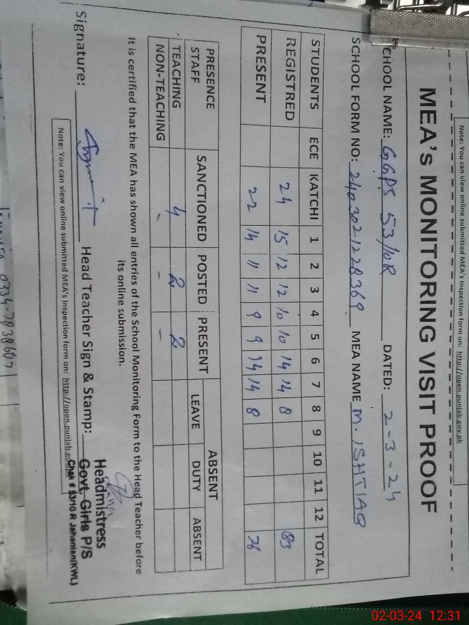| Attendance Register | Head Teacher | MEA with School | Visit Proof |