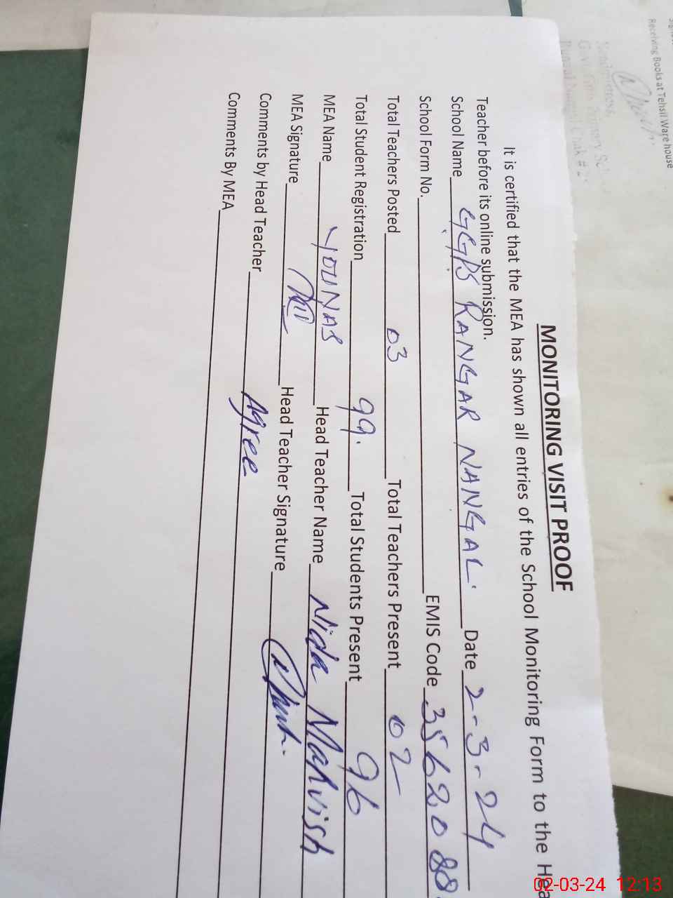 | EMIS Code: 35620886 | Name of School: GGPS RUNGAR NANGAL | |||