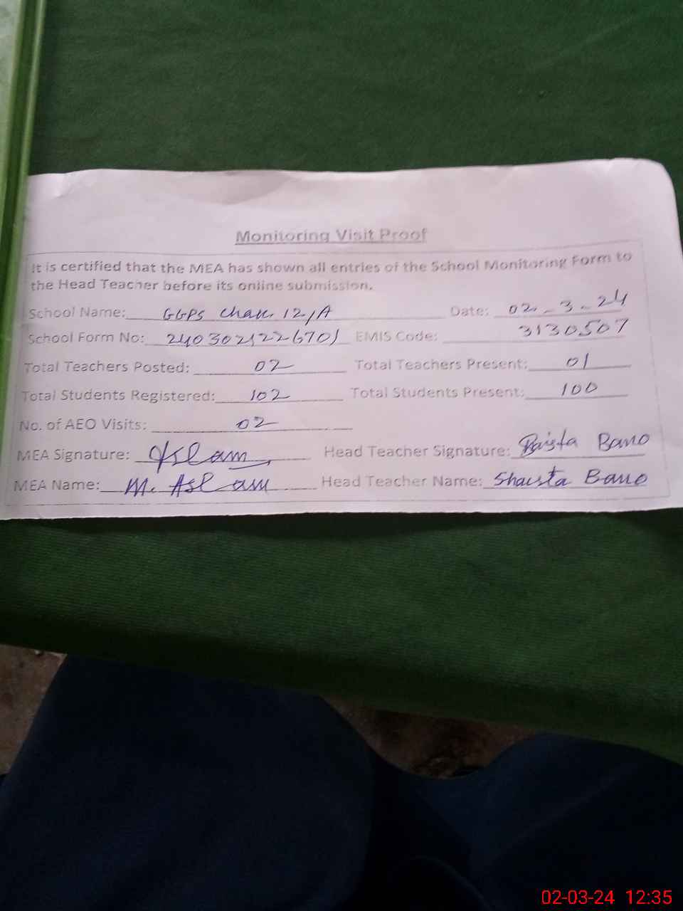 | EMIS Code: 31320507 | Name of School: GGPS CHAK NO.12/A | |||