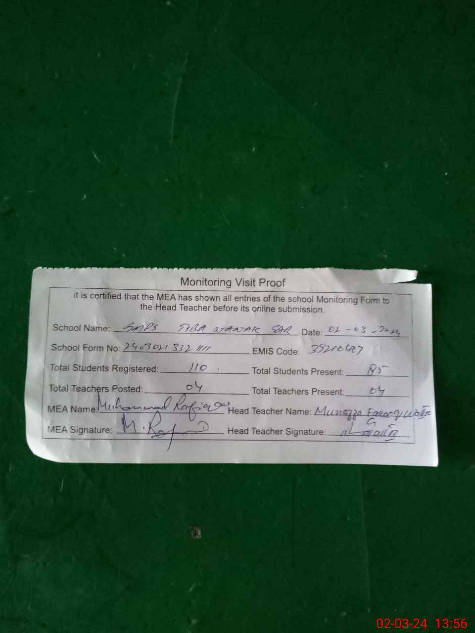 | Attendance Register | Head Teacher | MEA with School | Visit Proof |