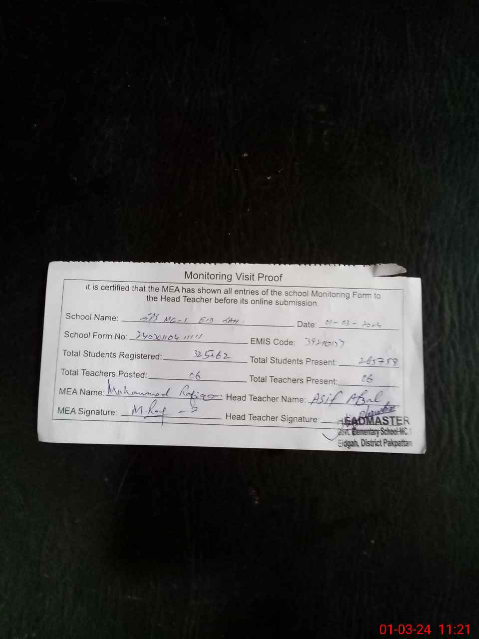 | Attendance Register | Head Teacher | MEA with School | Visit Proof |