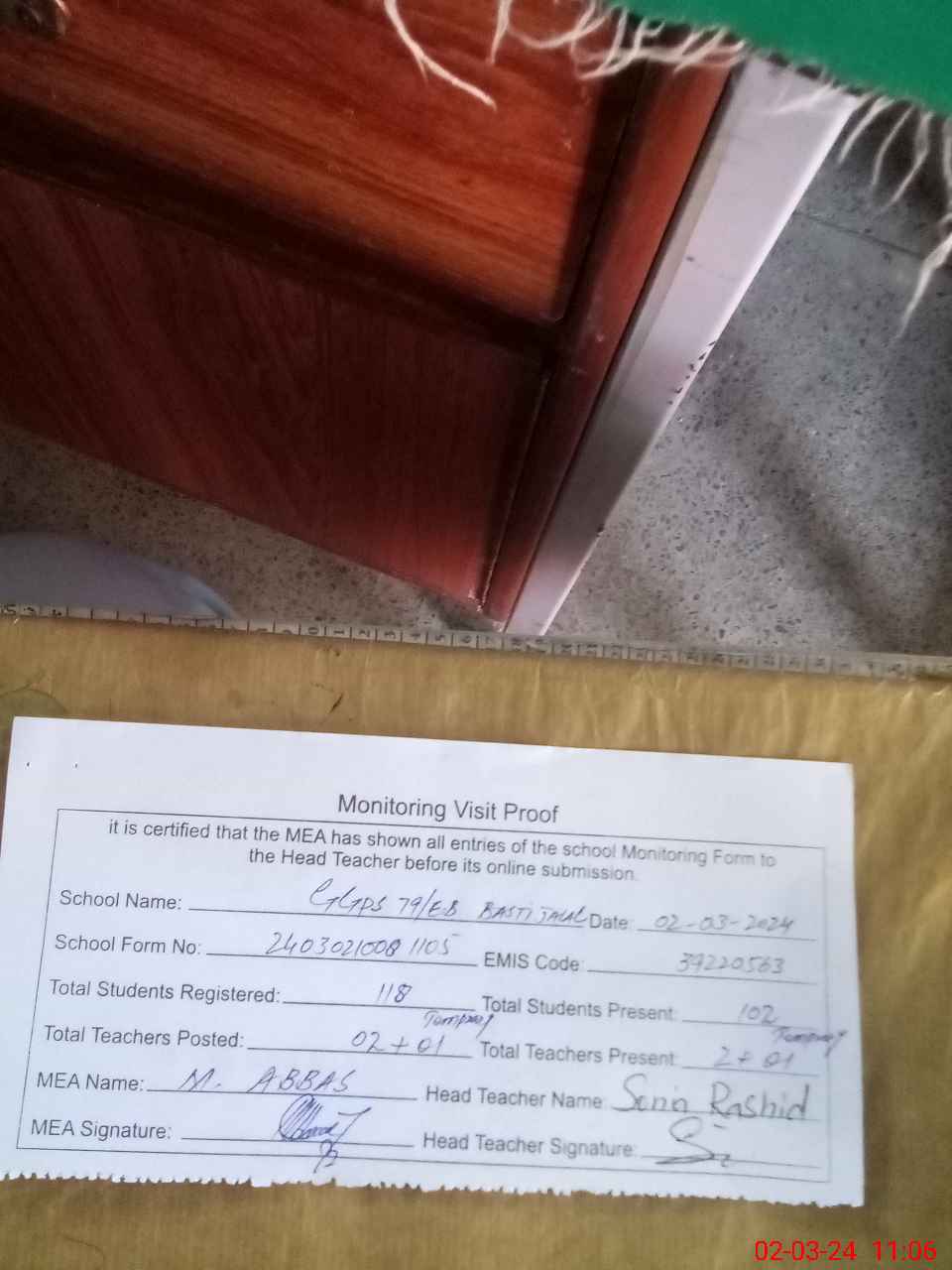 | Certified that this School was Inspected by the Undersigned MEA/DMO Today and the Information Stated Above is as Per Record. | |||||