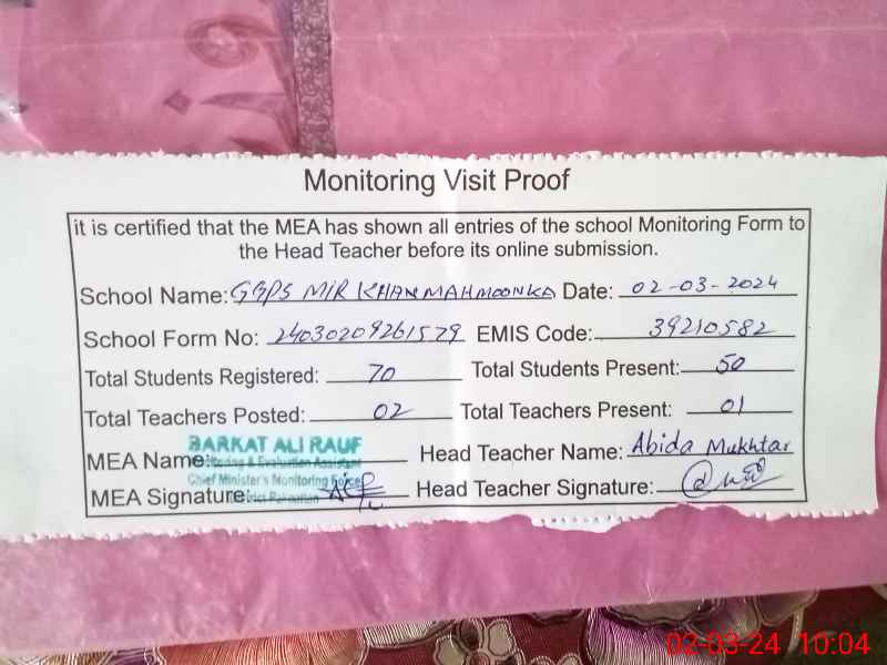 | EMIS Code: 39210582 | Name of School: GGPS MIR KHAN MAHMOONKA | |||