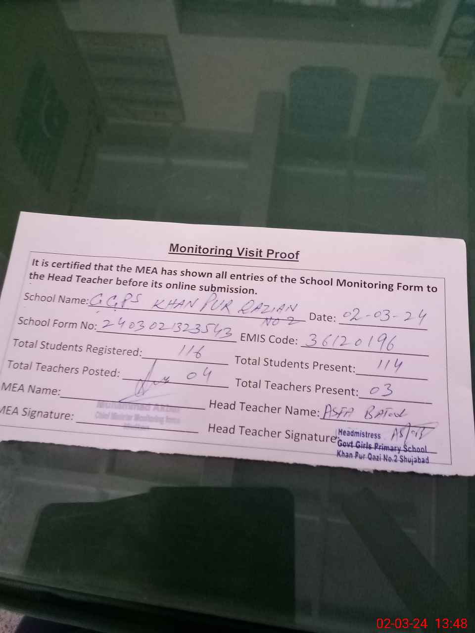 | EMIS Code: 36120196 | Name of School: GGPS KHAN PUR QAZI NO.2 SHUJABAD | |||