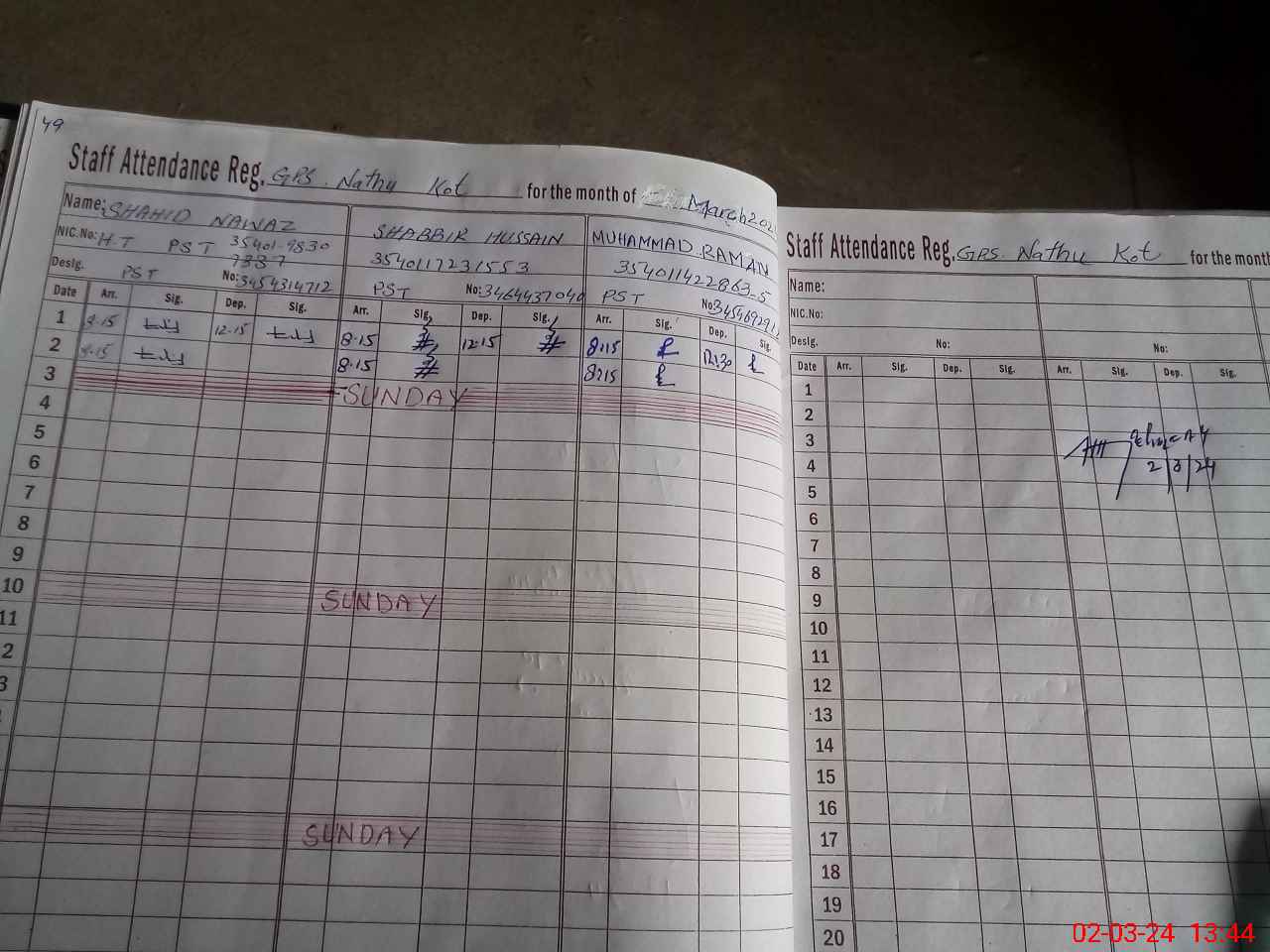 | CNIC | Full Name | Designation | R/C | Absence During Last Calender Month |