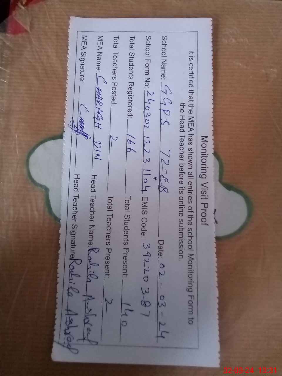 | Attendance Register | Head Teacher | MEA with School | Visit Proof |