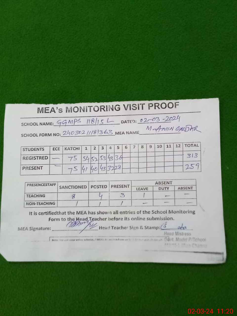 | Attendance Register | Head Teacher | MEA with School | Visit Proof |