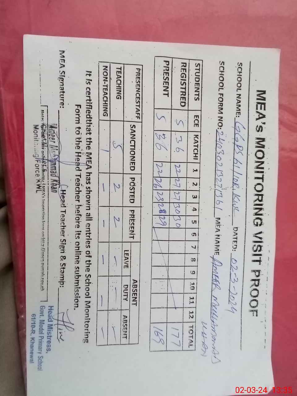 | Attendance Register | Head Teacher | MEA with School | Visit Proof |