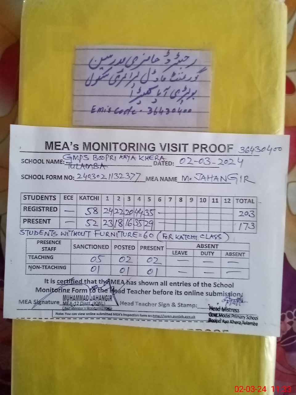 | EMIS Code: 36430400 | Name of School: GMPS BOOPRI AYA KHERA, TULAMBA | |||