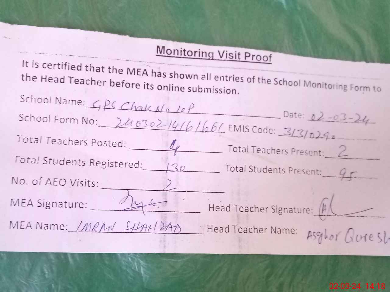 | Attendance Register | Head Teacher | MEA with School | Visit Proof |