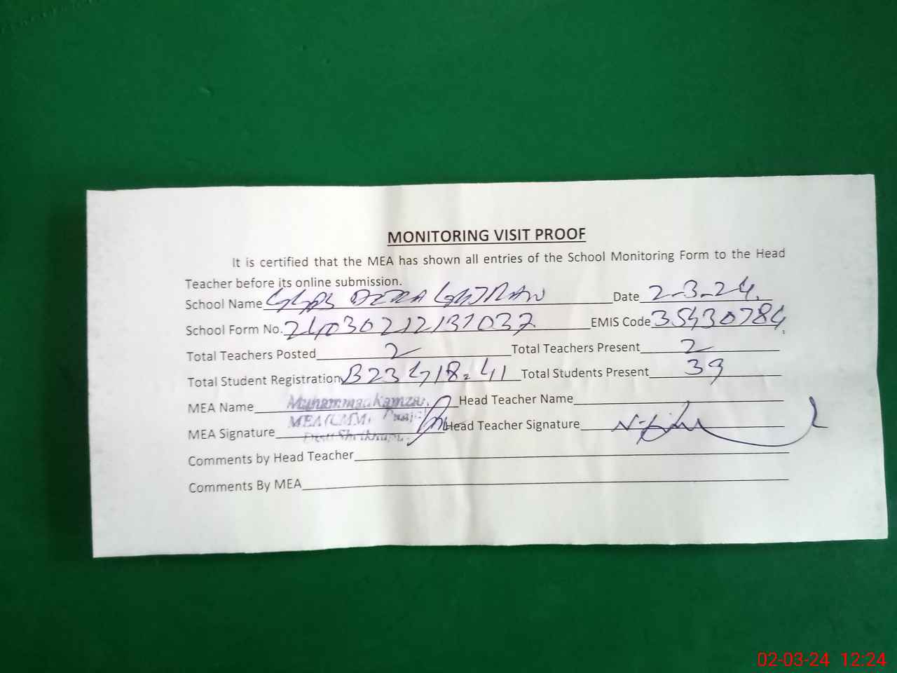 | Attendance Register | Head Teacher | MEA with School | Visit Proof |