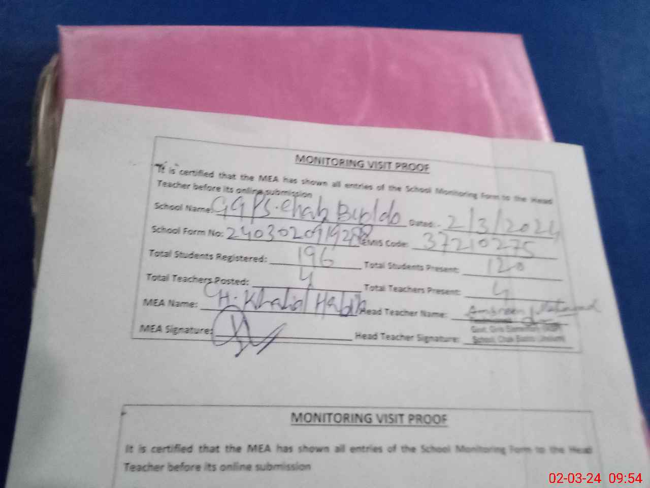 | Attendance Register | Head Teacher | MEA with School | Visit Proof |