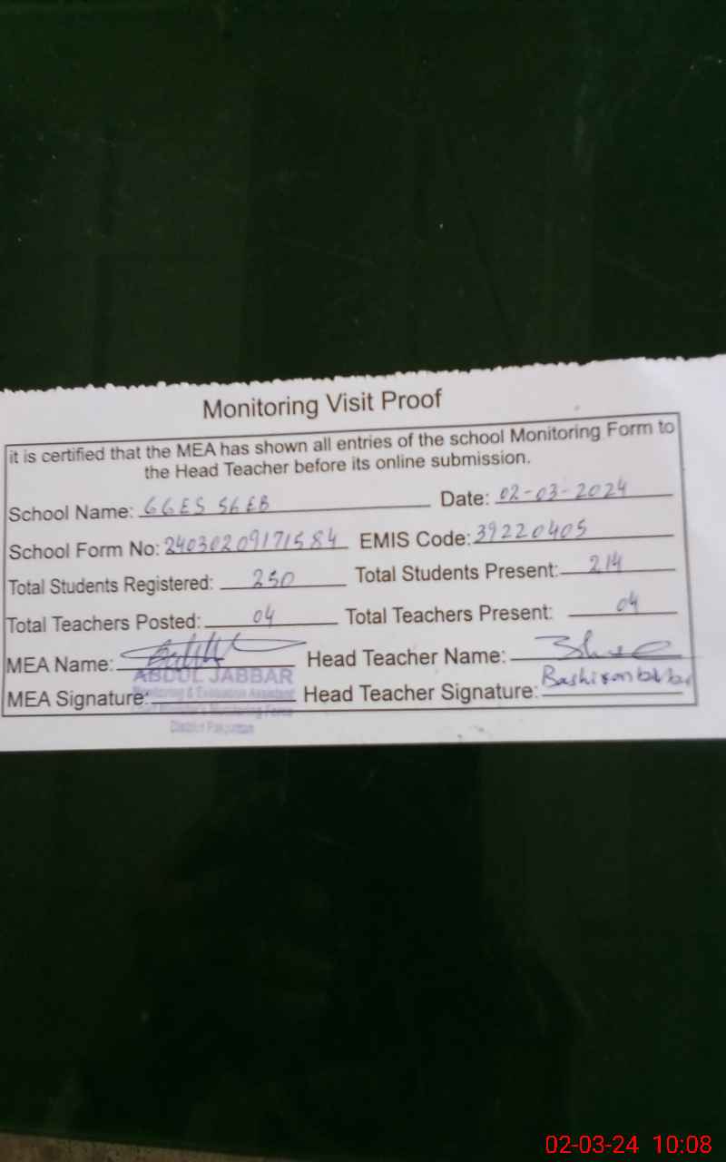 | School Visited by School Health & Nutrition Supervisor (No. of Visits) | 1 | Name1: | KASHIF BASHIR | Name2: | Nil |