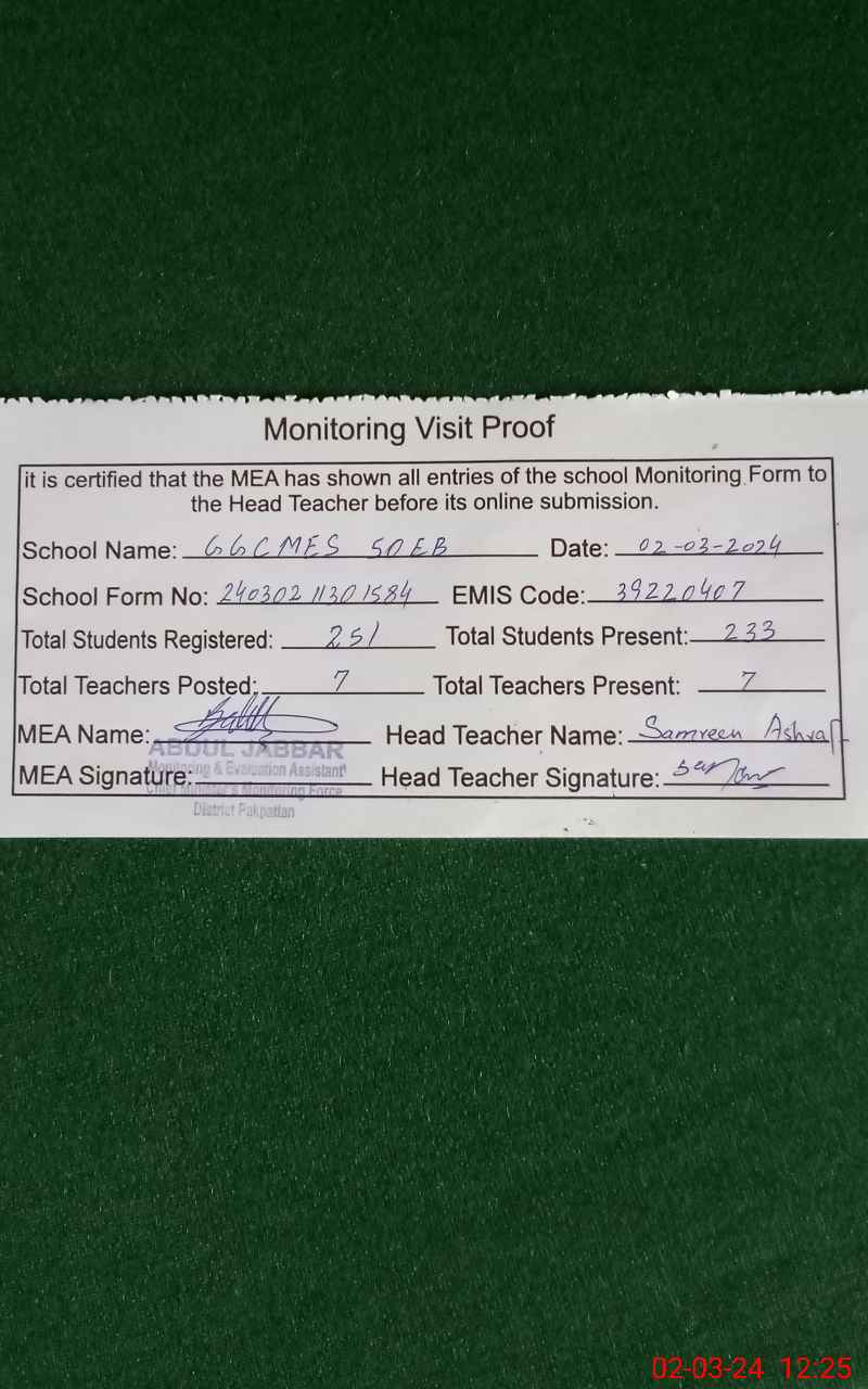 | Certified that this School was Inspected by the Undersigned MEA/DMO Today and the Information Stated Above is as Per Record. | |||||