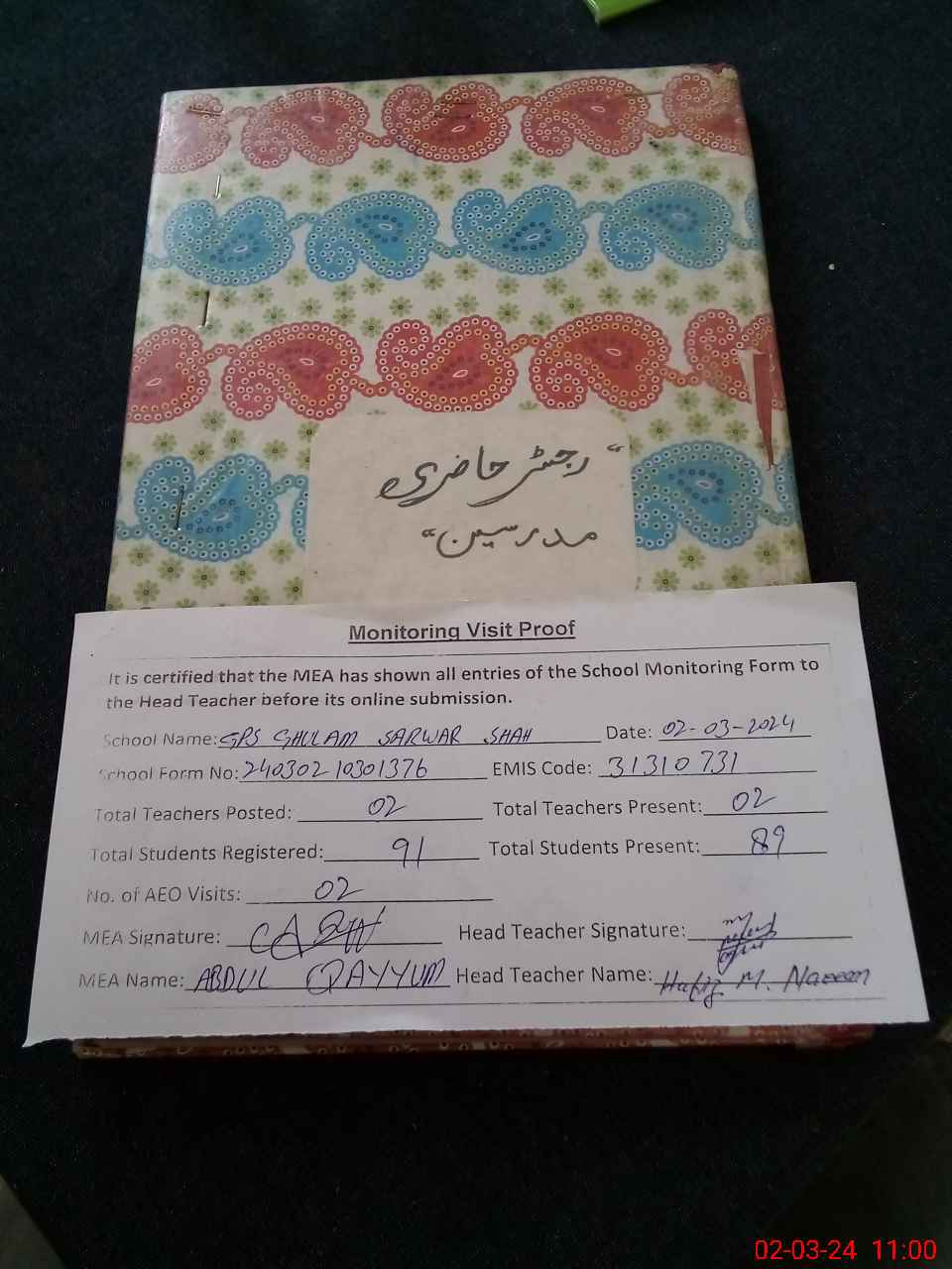 | Attendance Register | Head Teacher | MEA with School | Visit Proof |