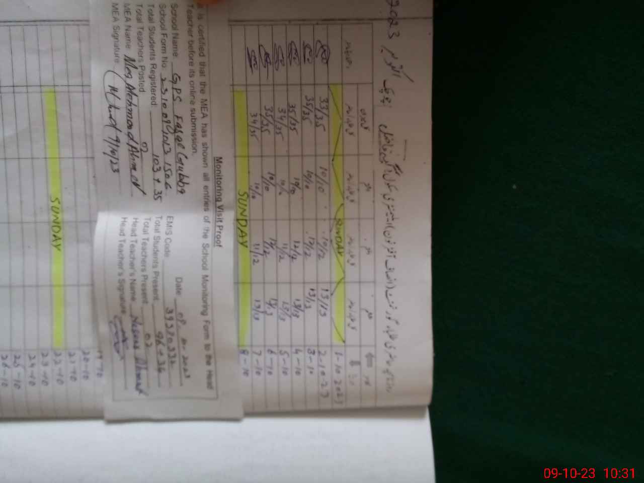 | Attendance Register | Head Teacher | MEA with School | Visit Proof |
