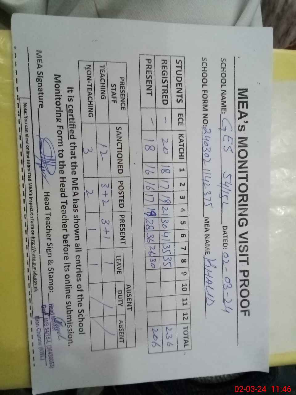 | Attendance Register | Head Teacher | MEA with School | Visit Proof |
