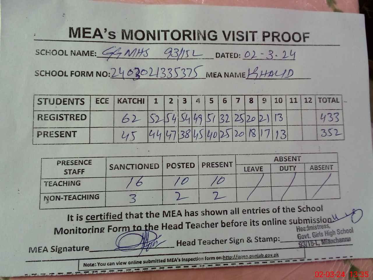 | Certified that this School was Inspected by the Undersigned MEA/DMO Today and the Information Stated Above is as Per Record. | |||||