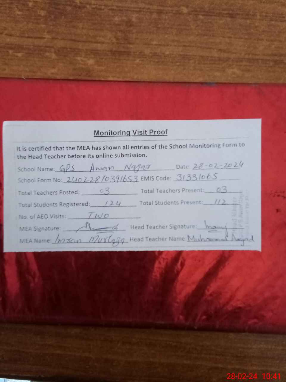 | EMIS Code: 31331065 | Name of School: GPS AWAN NAGAR | |||