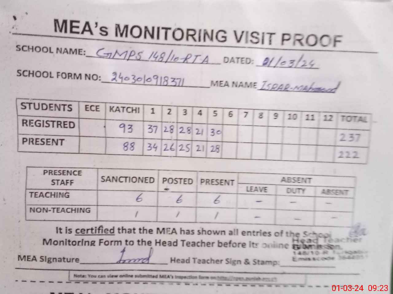 | Attendance Register | Head Teacher | MEA with School | Visit Proof |