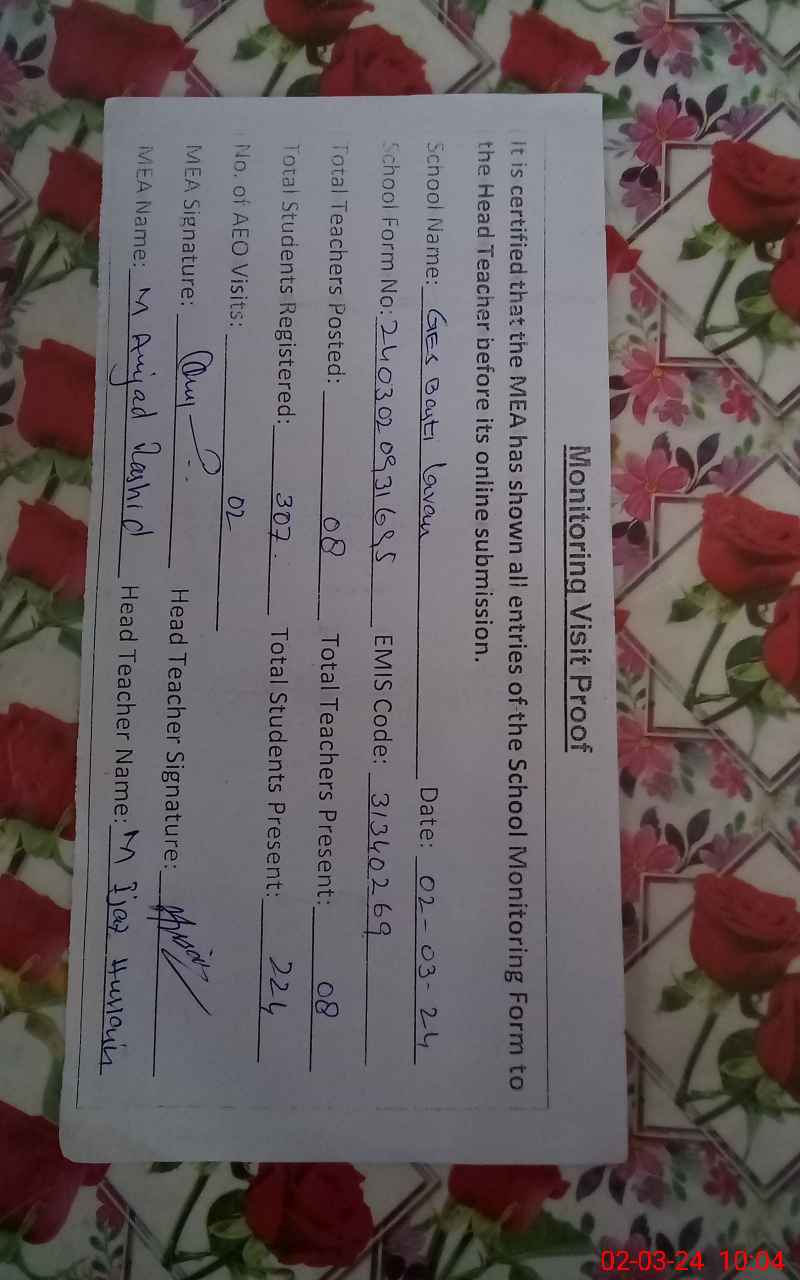 | Certified that this School was Inspected by the Undersigned MEA/DMO Today and the Information Stated Above is as Per Record. | |||||