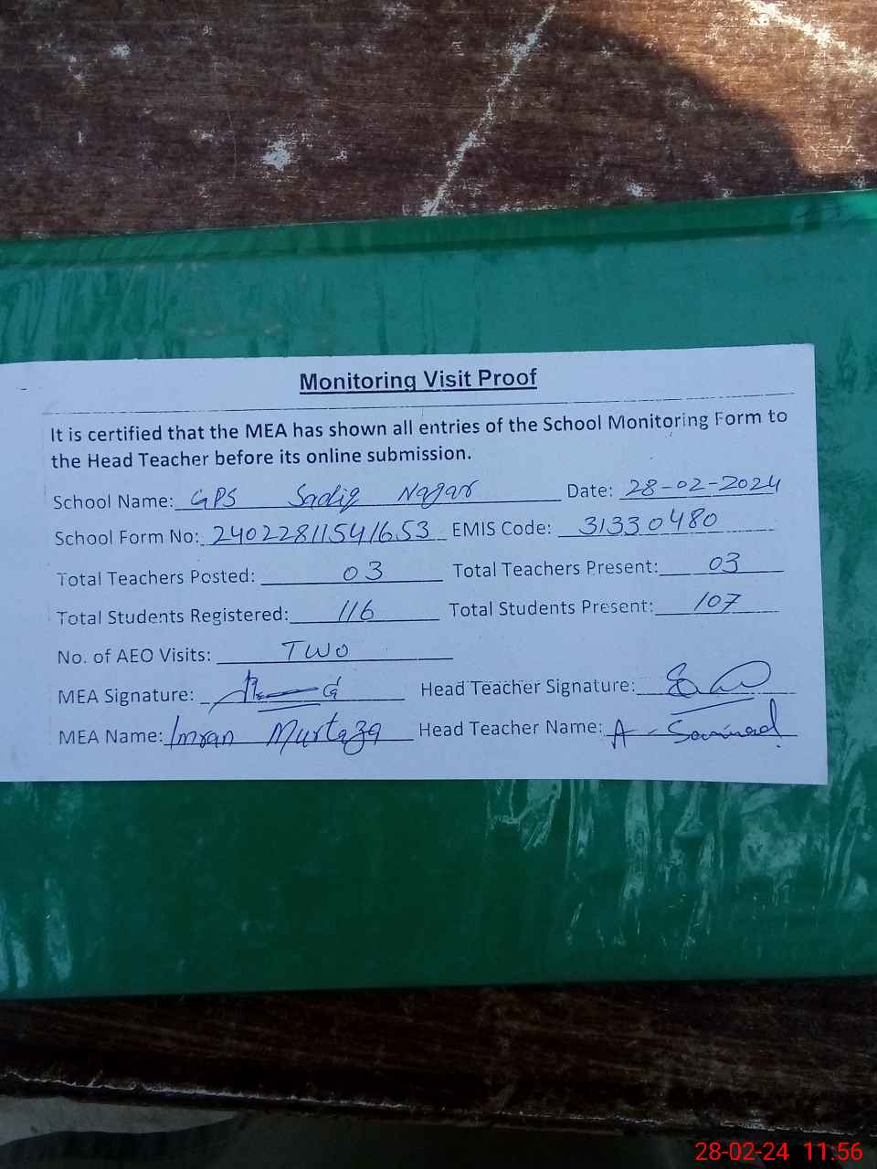 | Attendance Register | Head Teacher | MEA with School | Visit Proof |