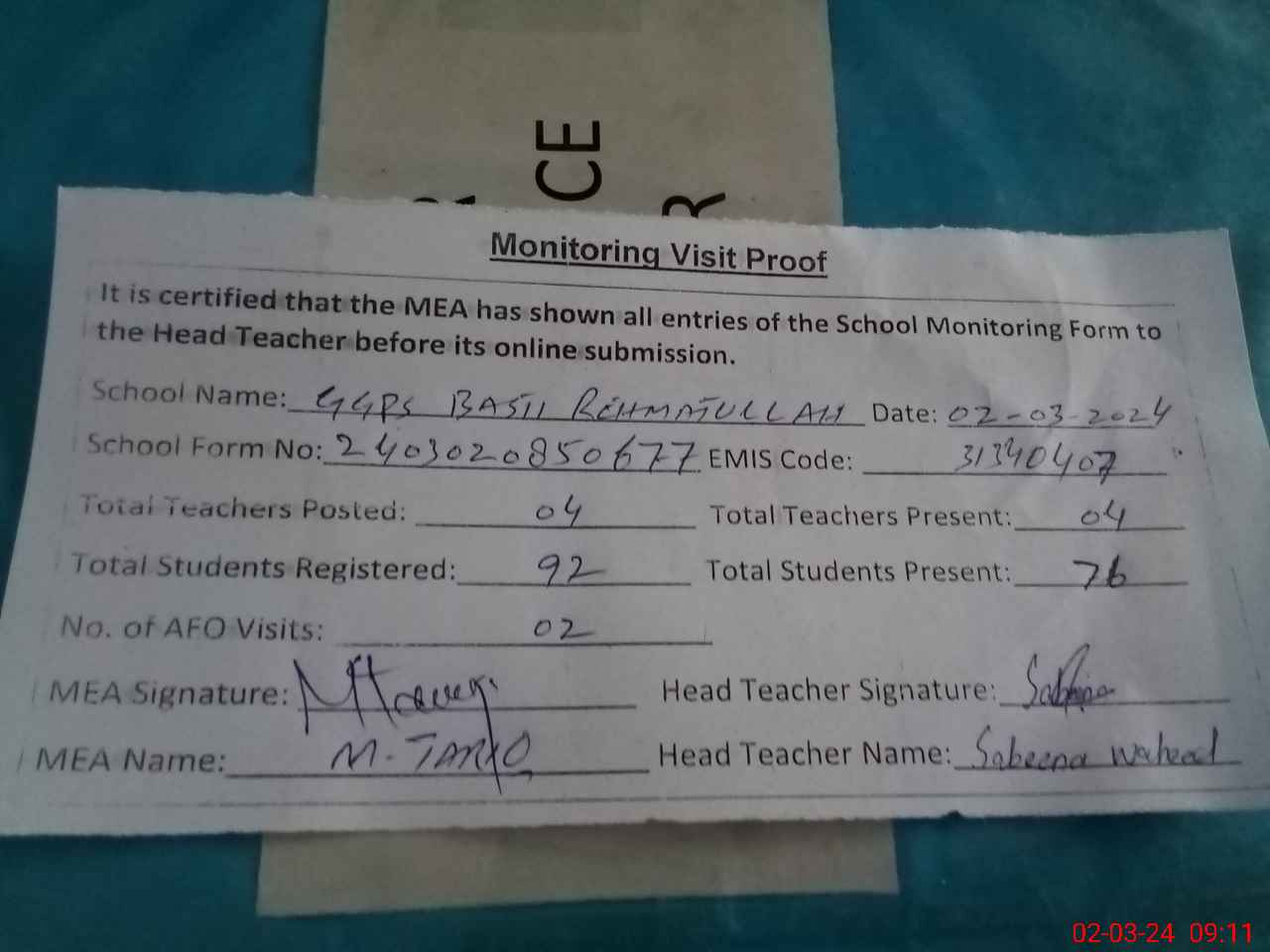 | EMIS Code: 31340407 | Name of School: GGPS BASTI REHMAT ULAH | |||