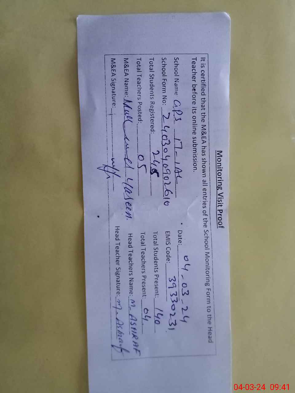 | EMIS Code: 39330231 | Name of School: GPS CHAK 17/1-AL | |||