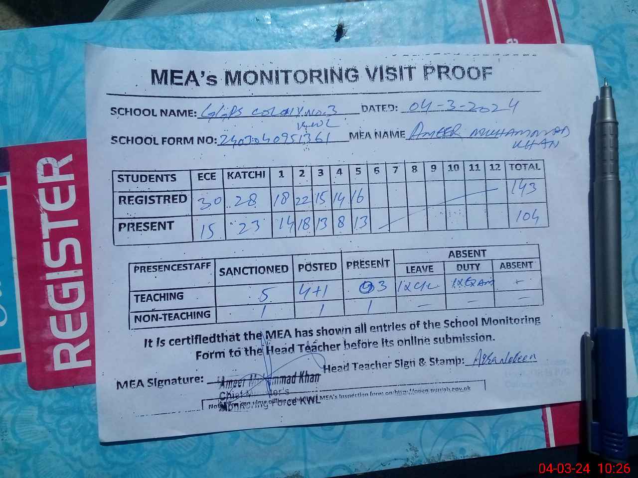 | Attendance Register | Head Teacher | MEA with School | Visit Proof |
