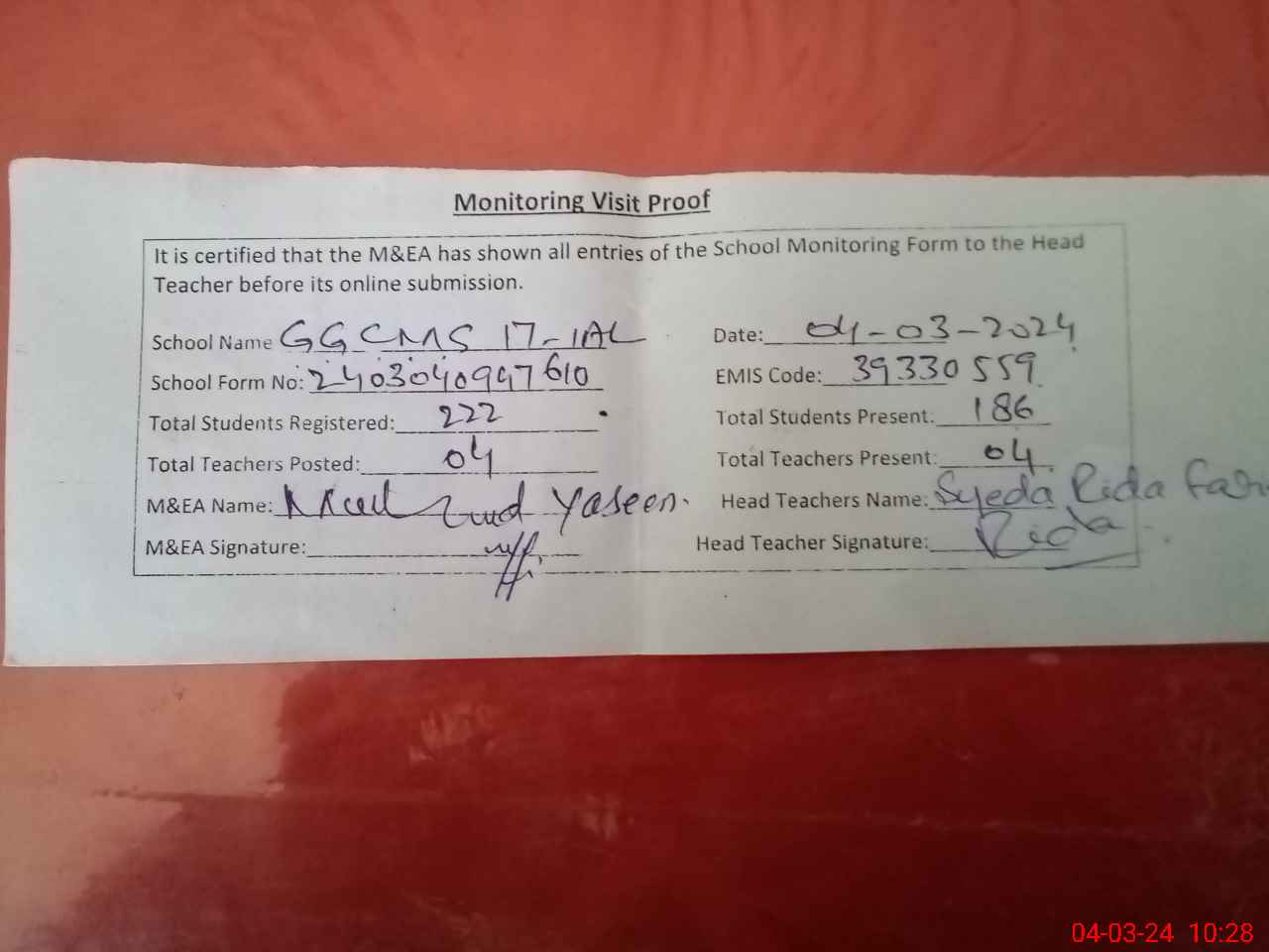 | Attendance Register | Head Teacher | MEA with School | Visit Proof |