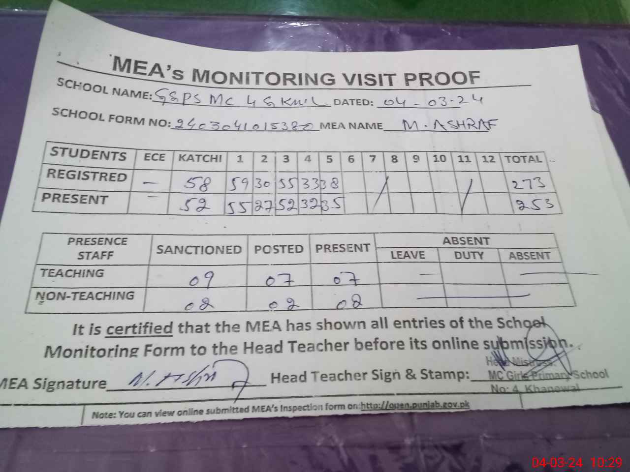 | Attendance Register | Head Teacher | MEA with School | Visit Proof |