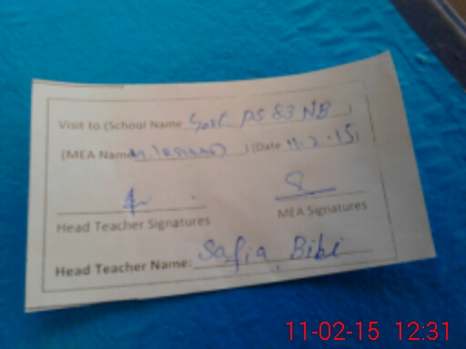 | School Visited by School Health & Nutrition Supervisor (No. of Visits) | 1 | Name1: | PIR AHMAD GHOUS | Name2: | |