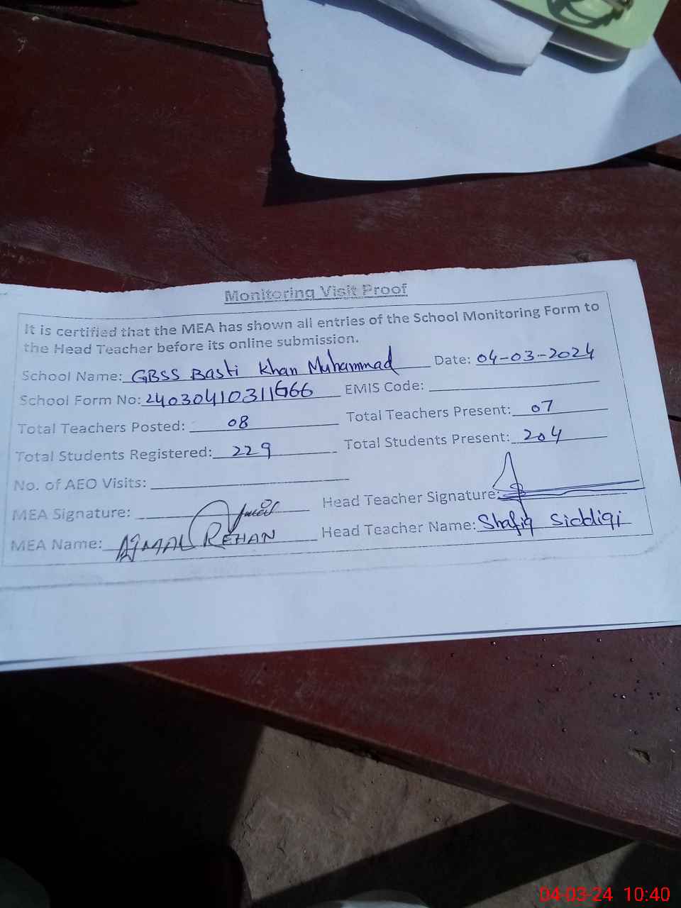 | EMIS Code: 31310065 | Name of School: GHS BASTI KHAN MUHAMMAD | |||