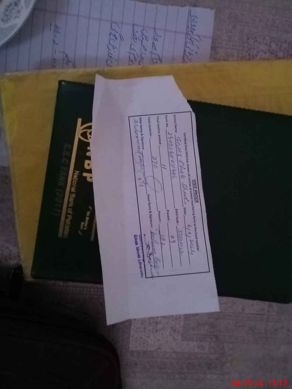 | Remarks (Use Separate Page if Required): Sir Teacher Abida Batool Absent from school Lab Attendance Faisal Raza was absent from school regularly no leave record shown approved from higher authorities according the x head teacher he was on X ordinary leave but record not shown Please check it and take action against him Give fake data of students attendance Night chokidar Inam ul haq was not present on his duty last three days | |||||