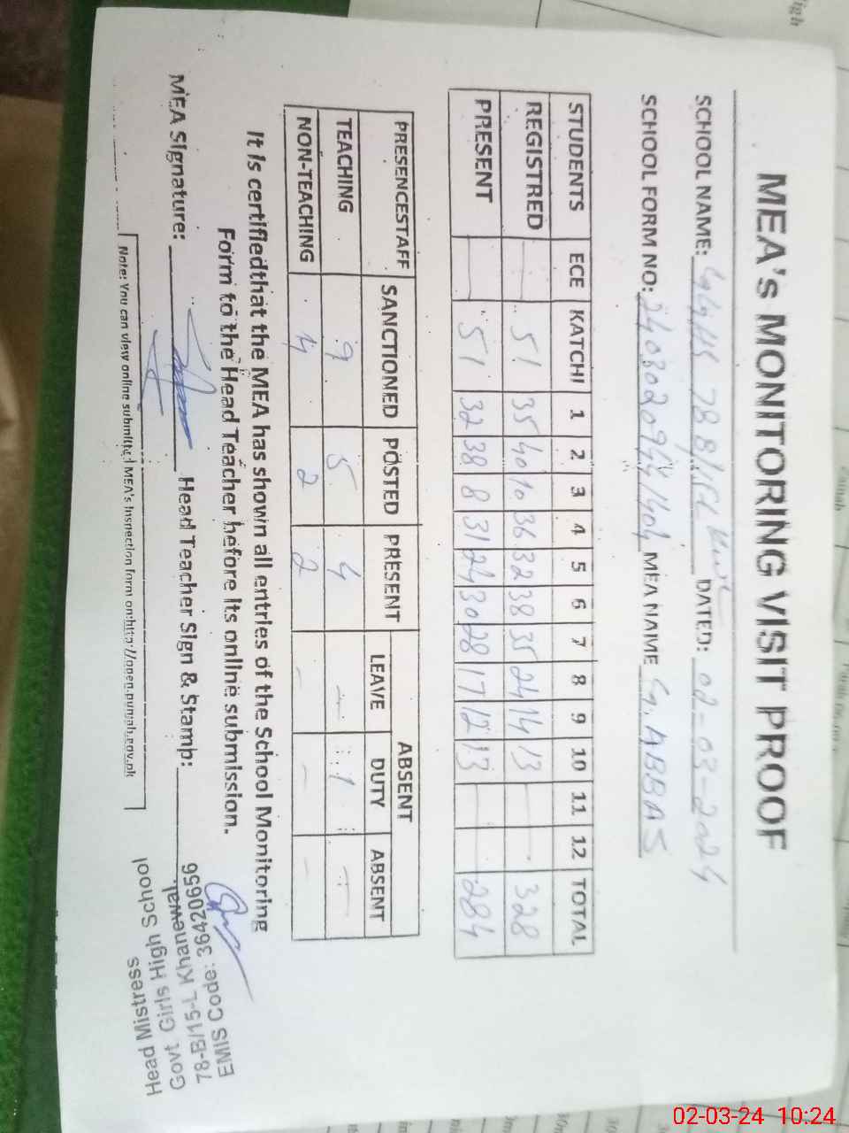 | Certified that this School was Inspected by the Undersigned MEA/DMO Today and the Information Stated Above is as Per Record. | |||||