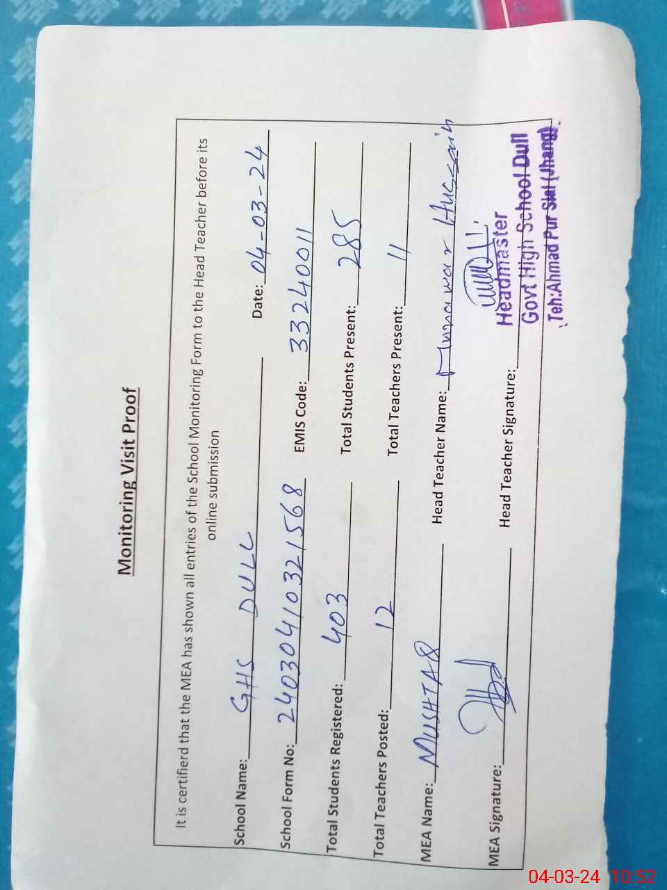 | Attendance Register | Head Teacher | MEA with School | Visit Proof |