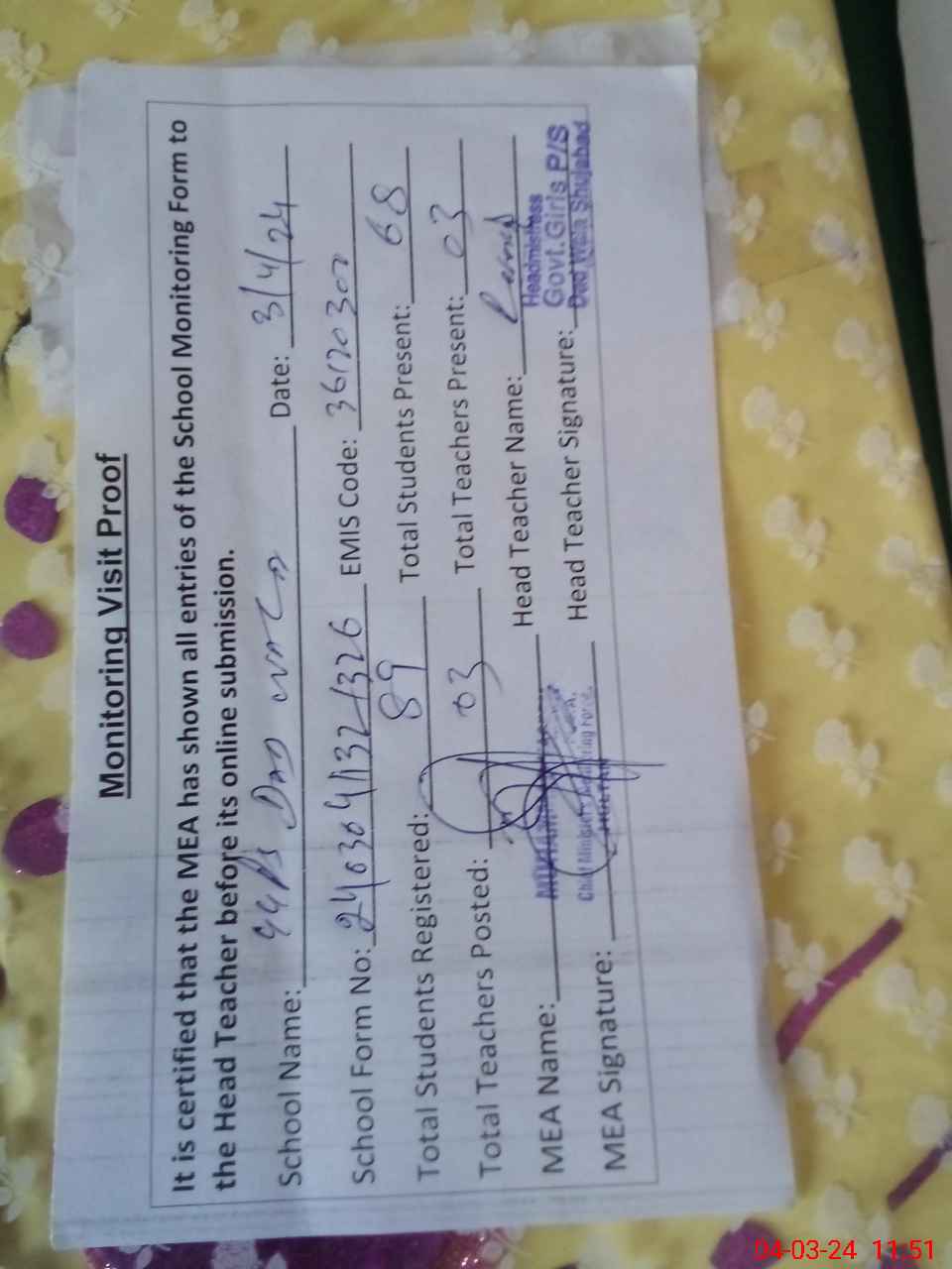 | Attendance Register | Head Teacher | MEA with School | Visit Proof |