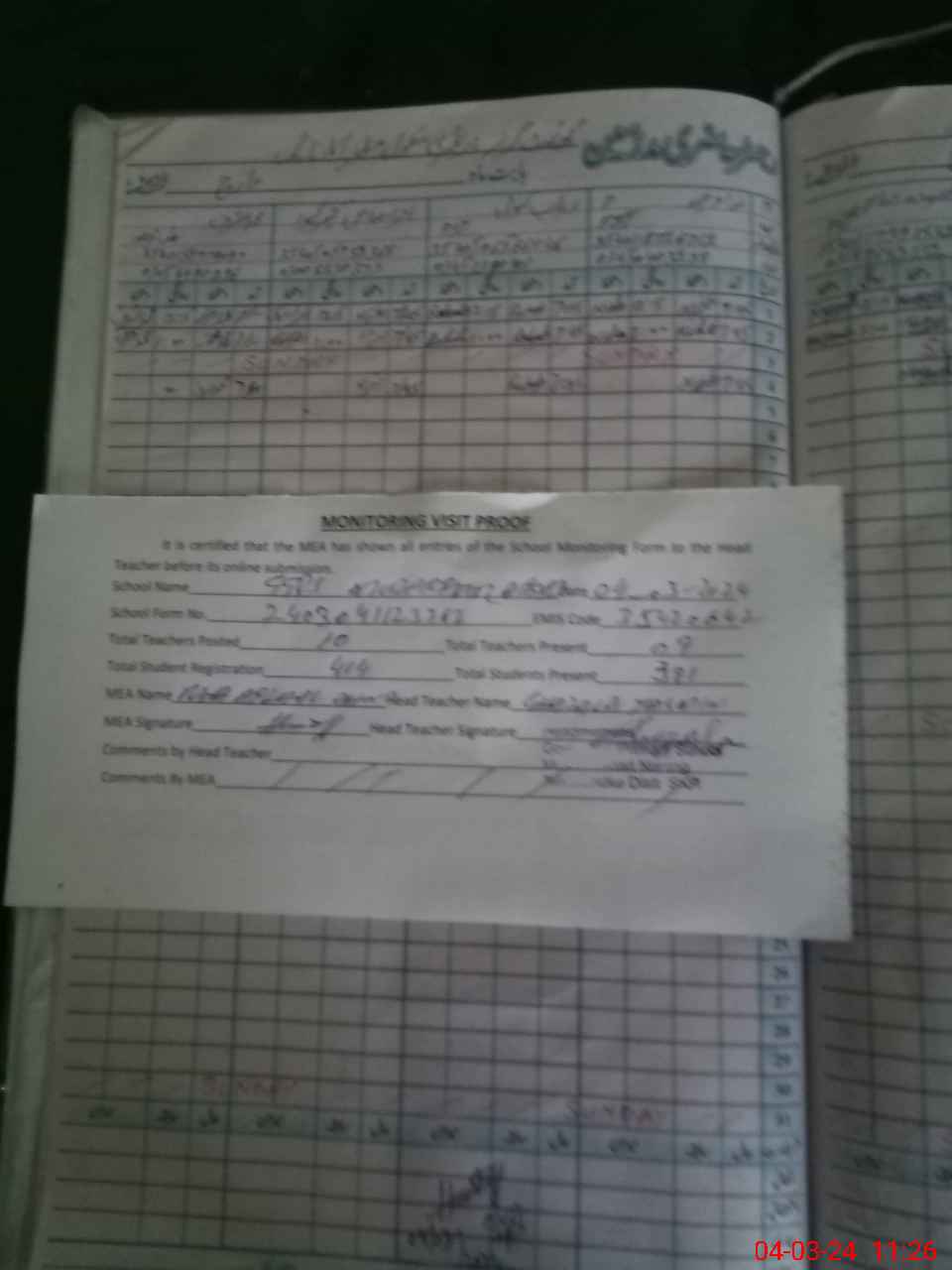 | Attendance Register | Head Teacher | MEA with School | Visit Proof |