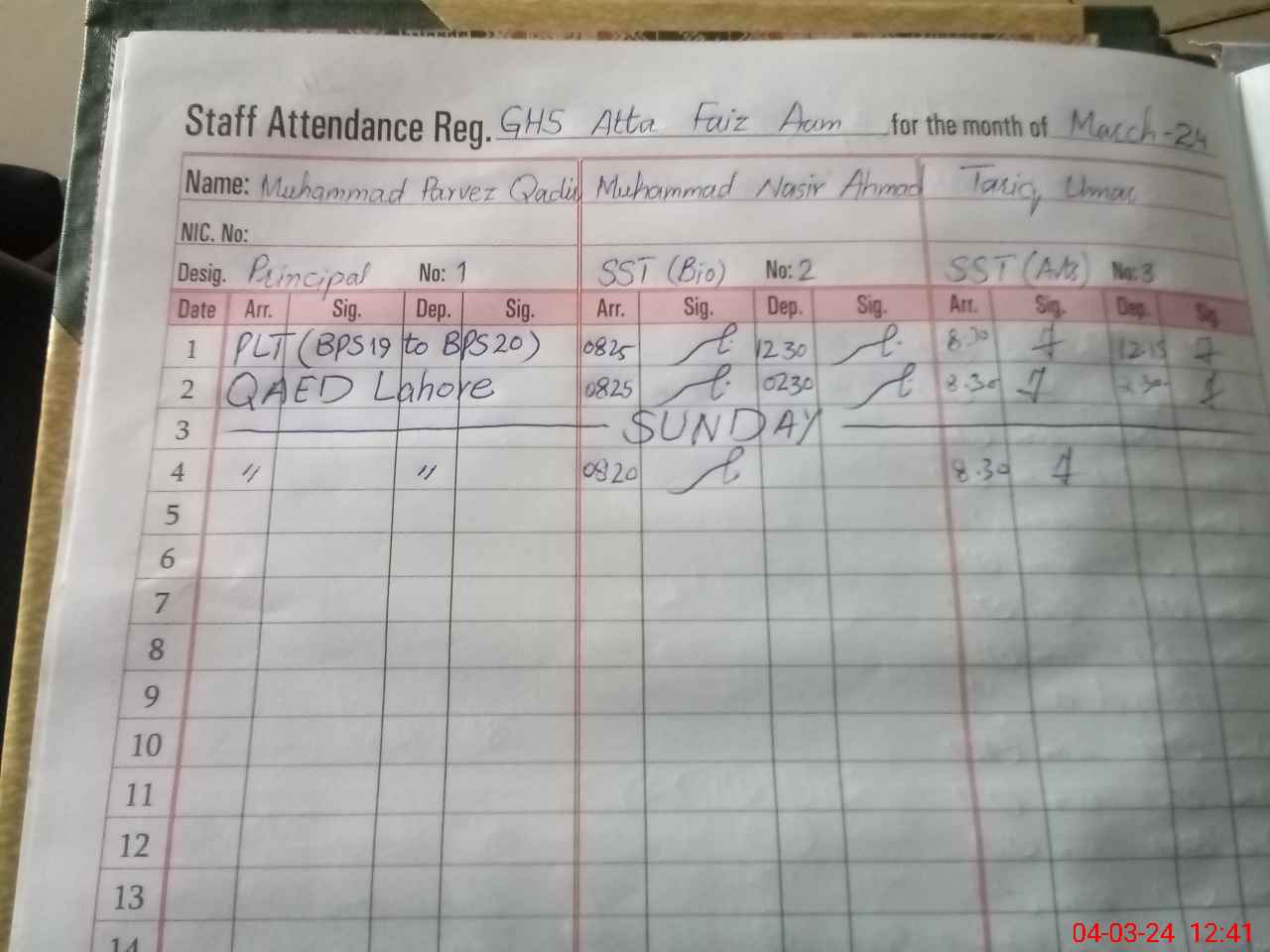 | CNIC | Full Name | Designation | R/C | Absence During Last Calender Month |
