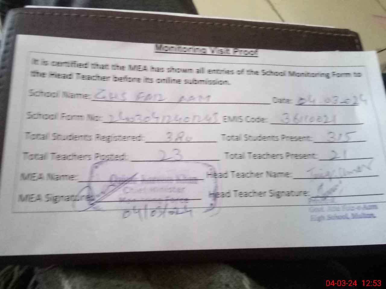 | Attendance Register | Head Teacher | MEA with School | Visit Proof |