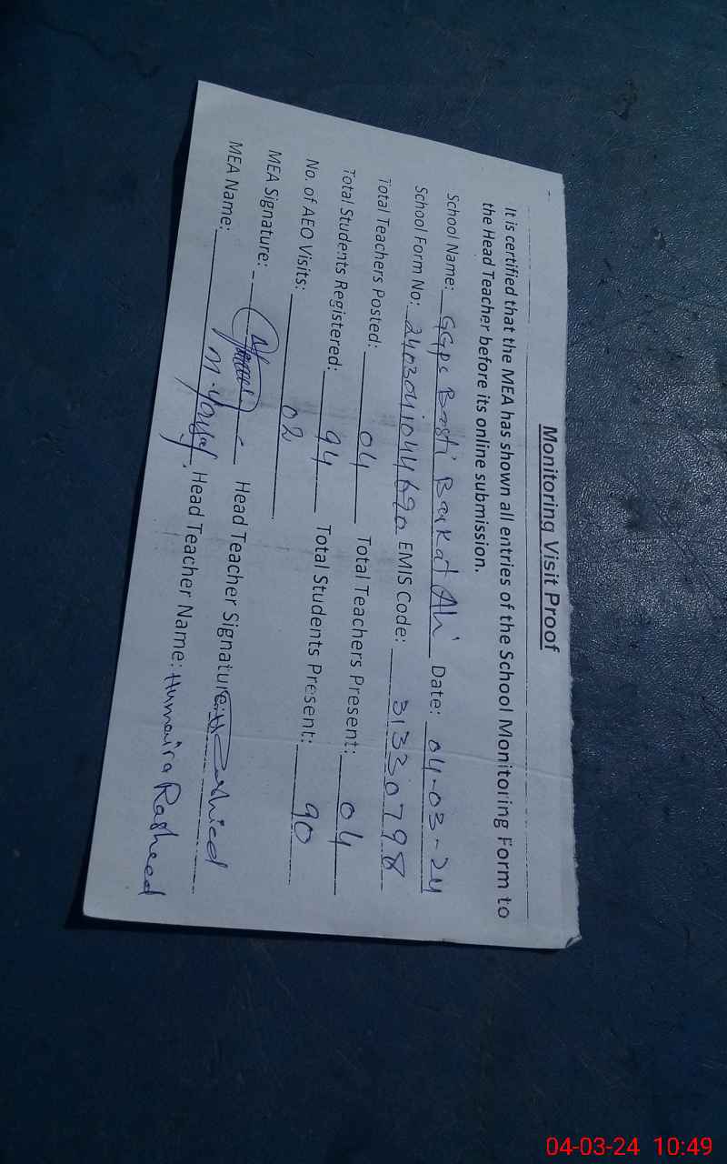 | Attendance Register | Head Teacher | MEA with School | Visit Proof |