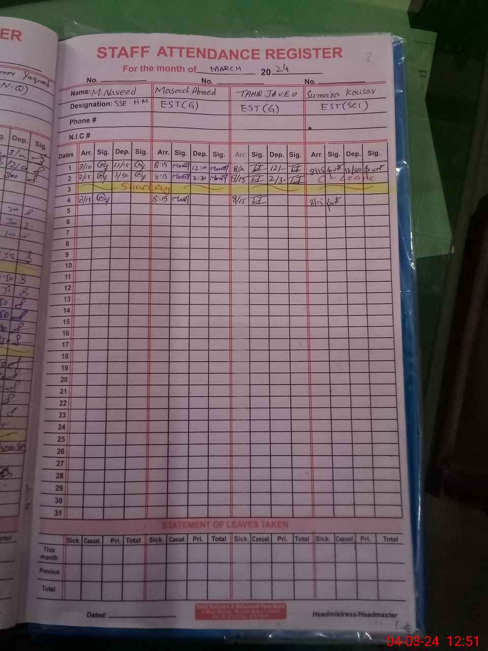 | Remarks (Use Separate Page if Required): Mrs Rashida Noreen PST found absent because head teacher failed to produce approved her leave | |||||
