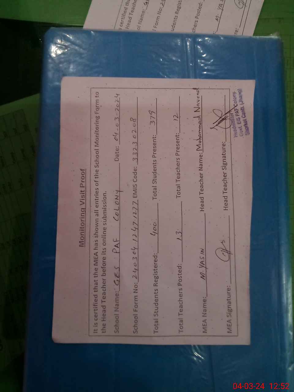 | Attendance Register | Head Teacher | MEA with School | Visit Proof |