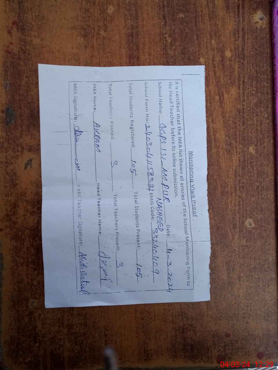 | Attendance Register | Head Teacher | MEA with School | Visit Proof |