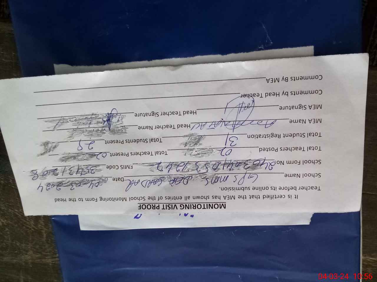 | Attendance Register | Head Teacher | MEA with School | Visit Proof |