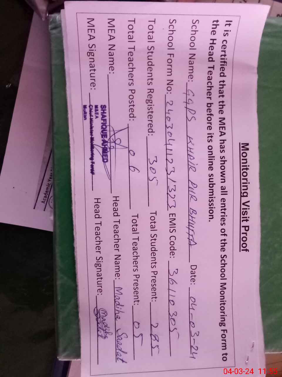 | EMIS Code: 36110305 | Name of School: GGPS KHAIR PUR BHUTTA QASIM BELA | |||