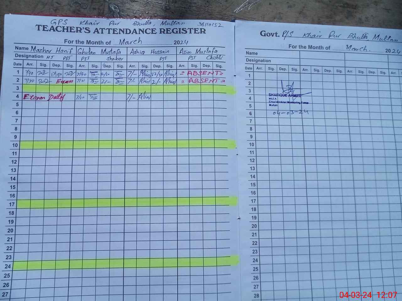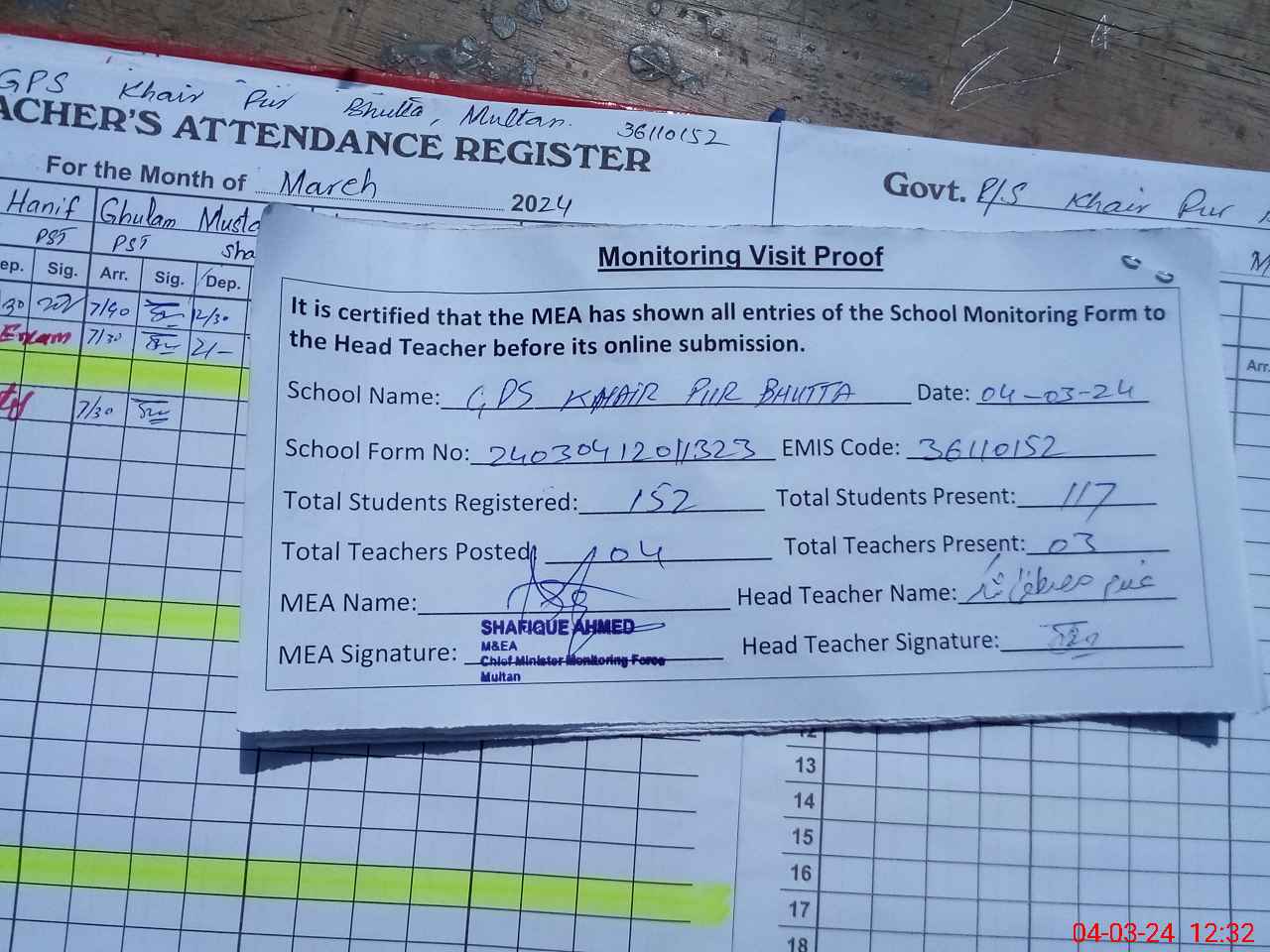 | EMIS Code: 36110152 | Name of School: GPS KHAIR PUR BHUTTA CANTT P/O QASIM BELLA | |||