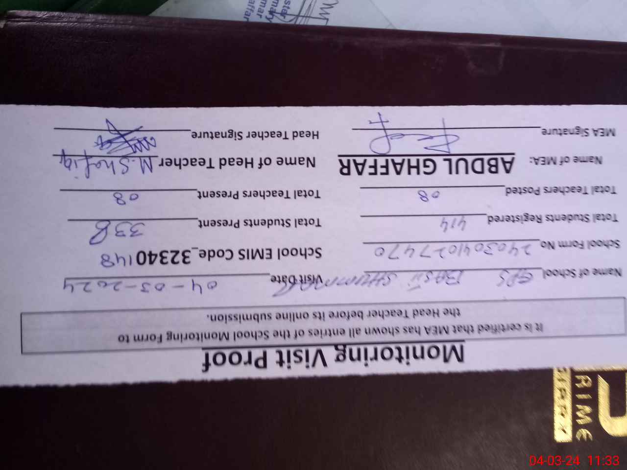 | Attendance Register | Head Teacher | MEA with School | Visit Proof |