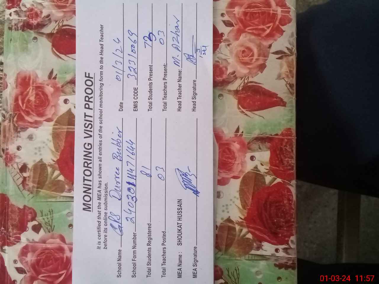 | EMIS Code: 32310069 | Name of School: GPS DUREE BABBER | |||