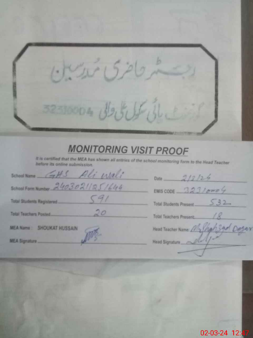 | EMIS Code: 32310004 | Name of School: GHS ALI WALI | |||